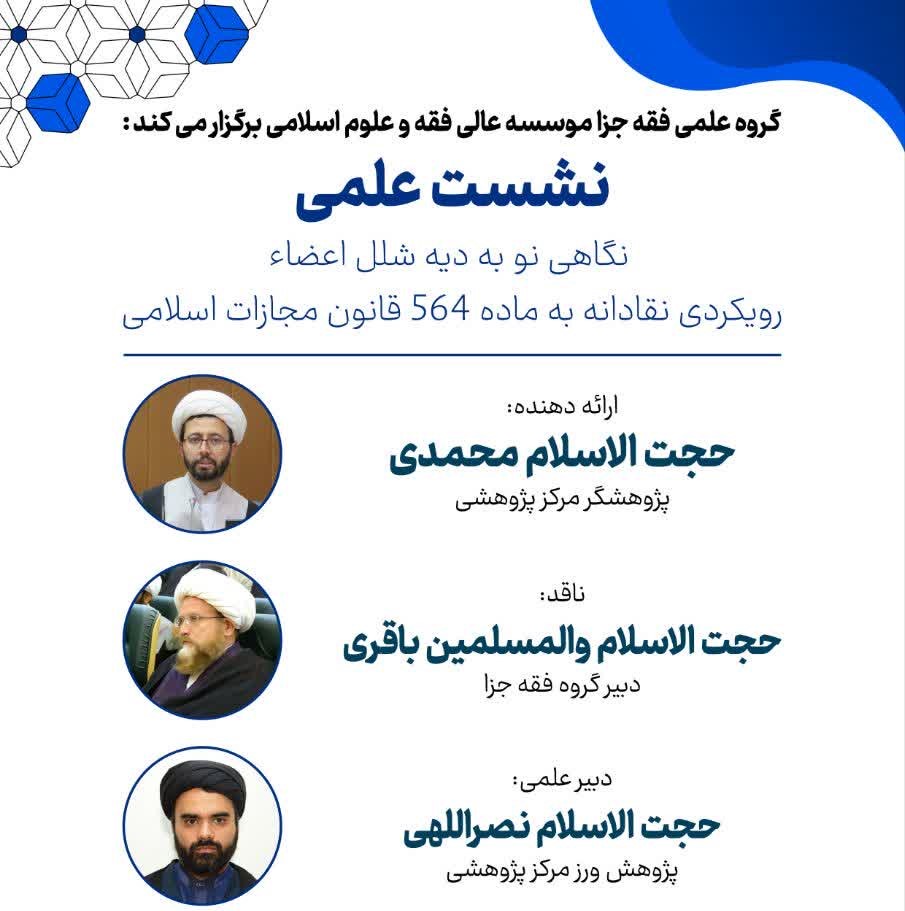 به گزارش روابط‌ عمومی مؤسسه عالی فقه و علوم اسلامی، نشست علمی با موضوع «نگاهی نو به دیه شلل اعضا؛ رویکردی نقادانه به ماده ۵۶۴ قانون مجازات اسلامی» روز دوشنبه ۲۱ مهرماه ۱۴۰۴ برگزار شد. این نشست با حضور جمعی از اساتید، پژوهشگران و دانش‌پژوهان، به همت گروه فقه جزا و با هدف بازخوانی و نقد مبانی فقهی و حقوقی ماده ۵۶۴ قانون مجازات اسلامی تشکیل شد؛ ماده‌ای که درباره دیه اعضای فلج (مشلول) و نسبت آن با دیه کامل یا ارش، در نظام فقهی و حقوقی سخن می‌گوید.